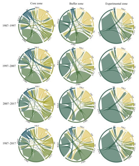 The vegetation conversion within each functional zone is illustrated in Figure 6. The different vegetation types in each functional area are transformed into each other, and some of the vegetation types are transformed into each other more obviously. For example, during 1987–2017, in the core zone, 8.42% of DBLF was converted to WTCF, and 21.23% of CTCF was converted to BF; in the buffer zone, 14.26% of DBLF became WTCF, and 22.47% of BF was converted to DBLF between 1987 to 2017; and in the experimental zone, during 1987–2017, 13.60% of DBLF was converted to WTCF, and 6.0% of WTCF was converted to EBLF.
