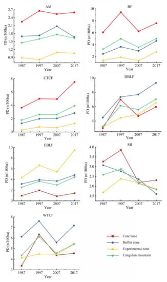 Changes in patch density for different vegetation types from 1987 to 2017.