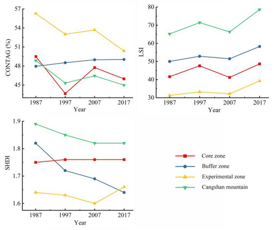 At the landscape level (Figure 8), the CONTAG value in the Cangshan mountain decreased, indicating a reduction in patch connectivity and an overall trend towards landscape fragmentation. The LSI showed an increasing trend, suggesting that the shape of landscape patches has become more complex. The SHDI exhibited a slight downward trend, indicating a slight decrease in landscape diversity. In the core zone, the LSI and SHDI showed an overall increasing trend, indicating an increased complexity of landscape patch shapes and enhanced landscape heterogeneity. The decrease in the CONTAG value suggests the emergence of more small patches in recent years, while the number of large patches has decreased, leading to a fragmented overall spatial distribution. In the buffer zone, the LSI exhibited an increasing trend, indicating a growing complexity of landscape patch shapes. The LSI value in the buffer zone was higher than that in the core zone and experimental zone, indicating that the landscape patch shapes in the buffer zone are more complex. The SHDI in the buffer zone showed a downward trend, indicating a decrease in landscape diversity. The CONTAG value in the buffer zone increased year by year, indicating enhanced landscape connectivity and reduced heterogeneity. In the experimental zone, the LSI and SHDI showed an overall increasing trend, indicating an increasing complexity of landscape patch shapes and enhanced landscape heterogeneity. The decrease in the CONTAG value suggests the emergence of more small patches, while the number of large patches has decreased.