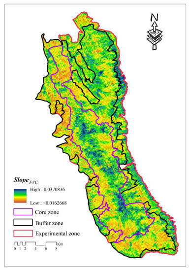 Examining the annual trend of FVC (Figure 10), we can observe that FVC has continued to increase in most areas of the Cangshan mountain during the study period, with the core zone showing a particularly significant improvement. However, certain regions of the buffer zone to the west and south have experienced a decrease in FVC. This change in pattern reflects the influence of climate change on FVC in the Cangshan mountain. For example, during the years 2009 to 2012, the study area faced moderate to severe drought, characterized by prolonged dry periods and consecutive years of drought [35,36], which had a negative impact on FVC [37]. It also demonstrates the effectiveness of macro-level ecological protection measures and management in the Cangshan mountain. The establishment of the nature reserve and the implementation of various protection measures and projects have positively impacted the vegetation in the Cangshan mountain.