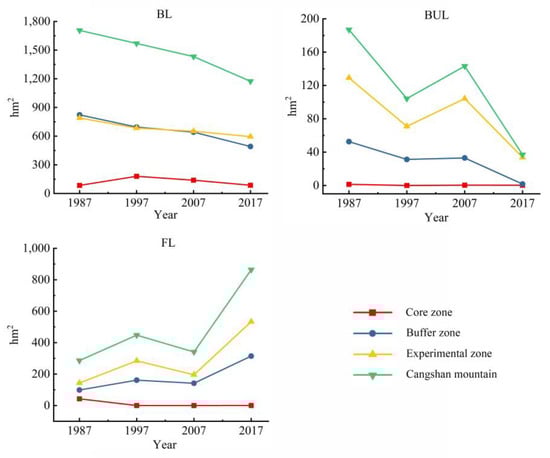 It is worth noting that, throughout the study area, there is a trend of increasing FL. However, the area of FL in the core zone has gradually decreased, while it has increased mainly in the buffer zone and the experimental zone, with the largest increase observed in the experimental zone. Additionally, the increased FL is primarily concentrated in the foothills of the eastern experimental zone and the western buffer zone, which are adjacent to the peripheral boundaries of the reserve where agricultural production and tourism activities occur. These areas are characterized by relatively flat terrain, making them highly vulnerable to human disturbances. The increase in FL in the eastern experimental zone and the western buffer zone reflects the conflicts between conservation efforts in the Cangshan mountain and community development.