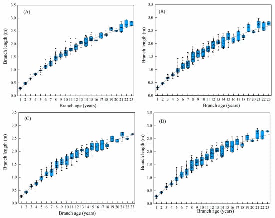 - Wang, C.; Li, F.R.; Jia, W.; Dong, L. Branch growth of Korean pine plantation based on nonlinear mixed model. Chin. J. Appl. Ecol. 2013, 24, 1945–1952. Available online: http://www.cjae.net/CN/Y2013/V24/I7/1945 (accessed on 4 March 2023).