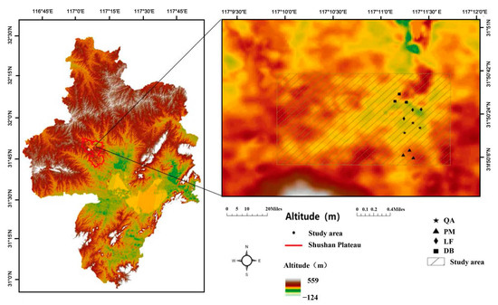 The Shushan Urban Forest Park (31°50′44″ N, 117°10′37″ E, altitude 97–110 m a.s.l.) is located in Hefei city, Anhui province, East China, and covers a total area of 1003.01 hectares (Figure 1). It is part of the Dabieshan Mountain range and is located in a transition zone from subtropical to warm temperate climates, characterized by distinct seasonality. The annual average rainfall is around 1000 mm, with the majority falling between April and September, accounting for over 70% of the total annual rainfall. The annual mean temperature ranges from −20.6 °C to 41.2 °C. The park is comprised of four main vegetation types, including three plantations (Pinus massoniana [PM], Quercus acutissima [QA], and Liquidambar formosana [LF]), and secondary deciduous broadleaved forest (DB). The DB forest also includes a diverse range of subcanopy tree species [34]. The three plantation stands, which are each approximately 60 years old, cover over 70% of the total forest area (Table 1). The soil type in the park is yellow-brown, developed from the weathered parent material of gabbroid. The soils are acidic and range in depth from 7 cm to over 100 cm [35].
