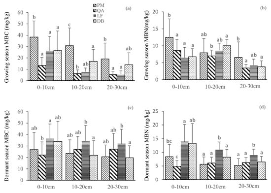 MBC content showed a decreasing trend from PM to DB to LF to QA in all three soil layers during the growing season. In the 0–10 cm soil layer, plantation PM had the highest MBC and MBN values, 38.4 mg/kg and 12.52 mg/kg, respectively, while values decreased with increasing soil depth (Table S2). Plantation QA and LF also showed a decreasing trend in MBC and MBN content with increasing soil depth, while MBC content in LF showed a decreasing trend ranging from 26.05 mg/kg to 5.53 mg/kg. The MBC content in DB also decreased with soil depth, with a range of 26.46 mg/kg to 14.07 mg/kg, while the MBN content showed an increasing trend followed by a decreasing trend, with a range of 10.04 mg/kg to 3.81 mg/kg. During the dormant season, plantation LF had the highest MBC and MBN values in all three soil layers. The MBC and MBN values in plantation PM decreased with increasing soil depth, with MBC ranging from 26.89 mg/kg to 20.54 mg/kg and MBN ranging from 8.37 mg/kg to 5.25 mg/kg. The MBC and MBN contents in LF and DB also decreased with increasing soil depth, with the highest MBC value in LF being 36.83 mg/kg and the lowest being 32.08 mg/kg, and the highest MBN value in LF being 13.95 mg/kg and the lowest being 9.05 mg/kg. The highest MBC value in DB was 33.99 mg/kg, while the lowest was 19.66 mg/kg, and the highest MBN value in DB was 13.32 mg/kg, while the lowest was 6.46 mg/kg.