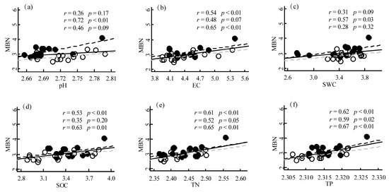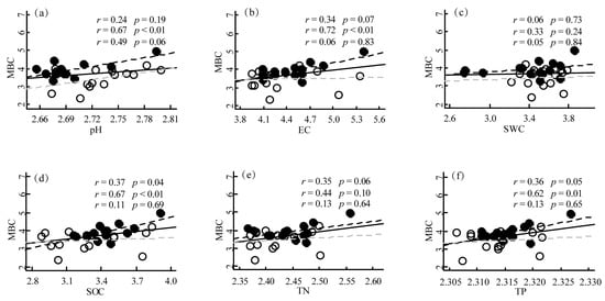 Linear relationships between soil physicochemical properties and soil MBC in the Pinus massoniana planation. (a) pH; (b) EC; (c) SWC; (d) SOC; (e) TN; (f) TP. The solid line represents the regression line of all the data points from all seasons. The dashed line represents the regression line of the data points from the growing season. The gray dashed line represents the regression line of the data points from the dormant season. The open circles represent the data points from the growing season. The solid circles represent the data points from the dormant season. The correlation coefficient (r) and p-value for the first row represent all seasons’ data, while the second and third rows represent the growing and dormant seasons’ data, respectively. EC, Electrical conductivity; SWC, Soil water content; SOC, Soil organic carbon; TN, Total nitrogen; TP, Total phosphorus.