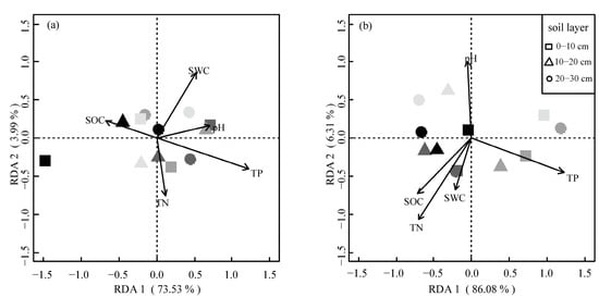 We used the decorana function to determine whether a linear or unimodal model was more appropriate and then standardized the data for each season. We generated RDA plots for each season and calculated the contribution of the explanatory variables. The RDA analysis for the growing season revealed that SWC, pH, TN, TP, and SOC were important environmental factors that influenced the distribution of MBC and MBN. The RDA 1 and RDA 2 axes explained 73.53% and 3.99% of the variation, respectively. The envfit function performed a significant test on these explanatory variables, which showed that they had a significant effect on MBC and MBN. The RDA analysis for the dormant season showed that SWC, pH, TP, TN, and SOC were key environmental factors that influenced the distribution of microbial biomass carbon and nitrogen. The RDA 1 and RDA 2 axes explained 86.08% and 6.31% of the variation, respectively. Similarly, the envfit function’s significant test results showed that these explanatory variables had a significant effect on MBC and MBN (Figure 5).