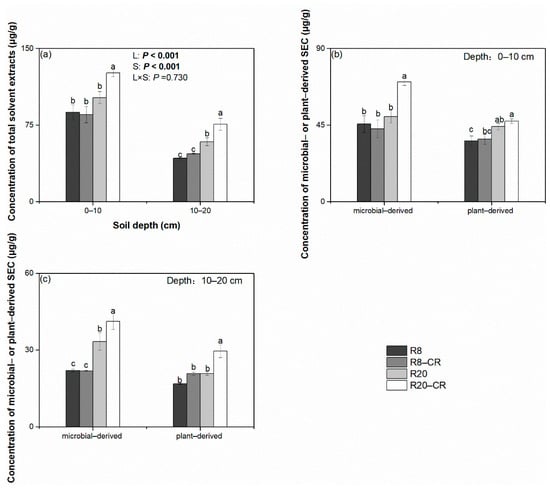 Concentrations of total and calculated sources of solvent extraction compounds (SEC) at 0–10 cm and 10–20 cm soil depths under four treatments. (a) Concentrations of total solvent extracts. (b,c) Concentrations of microbial-derived and plant-derived SEC at depths of 0–10 cm and 10–20 cm, respectively. L and S denote the effects of land use and soil depth, respectively (based on results of two-way ANOVA). Values in bold indicate significant treatment effects at p < 0.05. Values followed by different lowercase letters represent significant differences among the four treatments for the same soil layer (p < 0.05). Note: Robinia pseudoacacia plantations had been established for 8 (R8) and 20 (R20) years, and their adjacent croplands (R8–CR and R20–CR, respectively) were also analyzed.