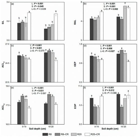Measurement of free lipids at 0–10 cm and 10–20 cm soil depths under four treatments: (a) ratio of short-chain n-alkanoic acids to long-chain n-alkanoic acids (S/L), (b) ratio of acyclic lipids to cyclic lipids (RAL), (c) average chain length of n-alkanes (ACLal), (d) odd-over-even predominance (OEP) for n-alkanes, (e) average chain length of n-alkanoic acids (ACLac), and (f) even-over-odd predominance (EOP) for n-alkanoic acids. Values in bold indicate significant treatment effects at p < 0.05. Values followed by different lowercase letters represent significant differences among the four treatments for the same soil layer (p < 0.05). Note: Robinia pseudoacacia plantations had been established for 8 (R8) and 20 (R20) years, and their adjacent croplands (R8–CR and R20–CR, respectively) were also analyzed.