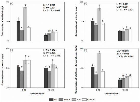 The concentrations of (a) vanillyls, (b) syringyls, (c) cinnamyls, and (d) total lignin-derived phenols under four treatments. Values in bold indicate significant treatment effects at p < 0.05. Values followed by different lowercase letters represent significant differences among the four treatments for the same soil layer (p < 0.05). Note: Robinia pseudoacacia plantations had been established for 8 (R8) and 20 (R20) years, and their adjacent croplands (R8–CR and R20–CR, respectively) were also analyzed.