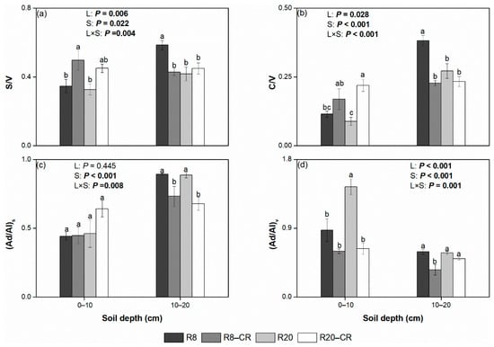 The parameters of lignin-derived phenols at 0–10 cm and 10–20 cm under four treatments: (a) the ratio of syringyls to vanillyls (S/V), (b) the ratio of cinnamyls to vanillyls (C/V), (c) the ratio of syringic acid to syringaldehyde ((Ad/Al)s), and (d) the ratio of vanillic acid to vanillin ((Ad/Al)v). Values in bold indicate significant treatment effects at p < 0.05. Values followed by different lowercase letters represent significant differences among the four treatments for the same soil layer (p < 0.05). Note: Robinia pseudoacacia plantations had been established for 8 (R8) and 20 (R20) years, and their adjacent croplands (R8–CR and R20–CR, respectively) were also analyzed.