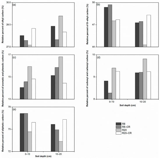 Figure 5 shows that the proportion of O-alkyl carbon was almost 50% in all four treatments, the largest component among the four functional groups of SOM. These results were in line with the findings of most previous studies [39,62]. The O-alkyl carbon compounds include carbohydrates, amino acids, and lignins [10]. A higher proportion of O-alkyl carbon generally means that the SOM is degraded relatively easily [19]. However, not all O-alkyl carbon groups are degraded readily; these groups may also be physically protected within soil aggregates or by the mineral matrix [17]. Across the 0–20 cm depth, R8 and R20 had lower O-alkyl carbon proportions than R8-CR and R20-CR, respectively (Figure 5). This indicates that the two R. pseudoacacia plantations had a relatively higher proportion of stable carbon in the carbon pool than the cropland.