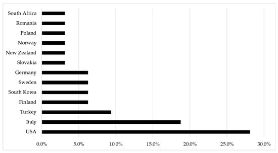 The papers in the database were categorised according to the pillar of sustainability to which they referred, namely monitoring of economic sustainability, environmental sustainability, or social sustainability of forest operations. While environment and economy showed a very similar percentage of studies, those dealing with the monitoring of societal sustainability via smart technologies were less represented (Figure 1). Concerning the share of papers among different countries, the highest number of studies were carried out in the USA, but a high percentage were performed in Italy, Turkey, and Scandinavian countries as well (Figure 2).