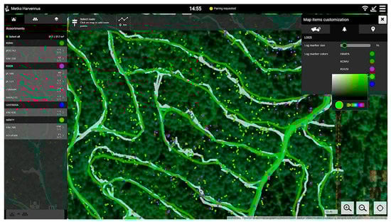 Valid instruments for forest management to ensure the traceability of forest products [49,50] as well as validate theoretical models regarding forest harvesting systems and efficiency [51] are made possible by the increasing performance of data acquisition, processing, and transmission brought on by new technological advancements (Industry/Forestry 4.0) and the application of the principle of Precision Forestry (PF) [52,53]. With the use of this technology, decision-makers can characterise wood resources in detail, including their geographical characteristics and stand factors. These data platforms or the usage of new harvesting equipment outfitted with this technology allow for the uploading of all data continuously gathered during normal working conditions as well as the option to request it as needed [54]. Therefore, it is usually possible to automatically record all the data related to the machine parameters as well as the characteristics of the harvested timber, such as metrics, species, or position, from the stand to the roadside, when a fully mechanised harvesting system with modern machines is applied [55]. It is moreover possible to view these data (fuel consumption, productivity, and position) online using the portal offered by the manufacturer. All these applications are made possible by the Controller Area Network (CAN-bus) system, which transmits machine status and parameters to the on-board computer (OBC) using the Standard for Forest Machine Data and Communication (StanForD), which is implemented in almost all contemporary forest harvesters and processors to record not only the machine engine and vehicle condition but also the parameters of the harvesting and felling operations [56]. As a result, modern forest machine automation data travel across a CAN-bus network that links all relevant components, including actuators, sensors, and controllers, to create a distributed control system. Hundreds of signals pertaining to harvester head performance and control, vehicle engine, and transmission operation and production parameters are continuously produced and processed by the control system [52]. The forest machine on-board control system, which also generates standard production and performance statistics based on measurements taken while working, serves as a conduit for communication between the control system and the human operator. Forest contractors can also track every vehicle from a single place utilizing the Fleet Management System (FMS) and CAN-bus technology in conjunction with Geographic Information Systems (GIS) [57]. The Fleet Management System makes it possible to maximise technical efficiency, boost productivity, and enhance vehicle and driver safety for a company. Usually, a combination of vehicle tracking (GNSS position), reporting on fuel use, monitoring driver conduct, and managing vehicle maintenance is used to achieve this. Additionally, the Fleet Management System can be used to more thoroughly investigate various facets of forest operations, including those connected to environmental performance (fuel consumption and CO2 emissions, among others), which become more and more relevant for both contractors and forest managers every day [58,59,60]. StanForD data can also be integrated with local allometric equations for the real-time monitoring of aboveground biomass and for the estimation and quantification of harvesting residues [61]. An example of StanForD data integrated with local topographic maps and with the OBC system of a forwarder is given in Figure 3.