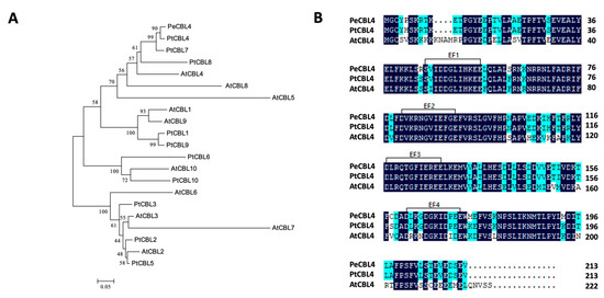 Total RNA was obtained according to a previously described method [29]. cDNA was synthesized and amplified using the following procedures: 94 °C for 1 min followed by 30 cycles of respective Tm for 50 s and 72 °C for 1 min using the TaKaRa Ex Taq Kit (TaKaRa). The primers of peCBL4 were designed based on the PtCBLs of Populus trichocarpa [30] and are provided in Supplementary Materials Tables S1 and S2. The cDNA product was sequenced after insertion into the pMD18-T vector. The putative amino sequences of PeCBL4 were aligned in DNAMAN software using the “multiple sequence alignment” method. The phylogenetic tree of the CBL family was constructed using the neighborhood joining Bootstrap method (Bootstrap N-J Tree) using Clustal X (1.8) software.