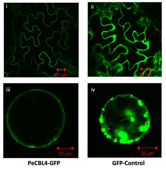 Subcellular localization of PeCBL4 was performed on Nicotiana benthamiana as described previously [31,32]. Briefly, the coding sequences of PeCBL4 were obtained using PCR (primers are displayed in Supplementary Materials Table S1) and cloned into the pBIB::GFP (GW) vector to generate pBIB::GFP-PeCBL4. The constructs were then inserted into Agrobacterium tumefaciens strain GV3101, and the GV3101 bacteria carrying the fusion construct pBIB::GFP-PeCBL4 and p19 protein were infiltrated into five-to-six-week-old N. benthamiana leaves, respectively. The infected N. benthamiana plants were cultivated for two days, and the leaves were prepared for microscopic analysis under GFP fluorescence and white light. Protoplasts from leaves were prepared as described in a previous study [31] for microscopic analysis of the fluorescence distribution.