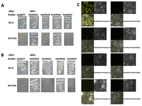 Unlike the yeast two-hybrid results, we found that there was also a signal response between PeCBL4 and PeCIPK25, although the fluorescence signal was weaker than that between PeCBL4 and PeCIPK24.
