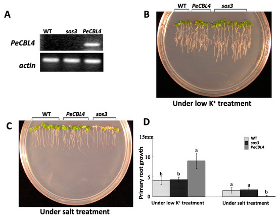 Phenotype analysis of transgenic plants of A. thaliana transformed with PeCBL4 (cbl4 background) under low K+ or high salt conditions. (A) Expression analysis of PeCBL4 in wild-type (WT), sos3 mutant, and PeCBL4 transgenic A. thaliana plants. The Arabidopsis actin gene was used as a control. (B) Phenotype analysis of WT, sos3 mutant, and PeCBL4 transgenic plants under low K+ stress. The root growth of the sos3 mutant was significantly longer than that of the WT. The PeCBL4 transgenic was similar to that of the WT under low K+ treatment. (C) Phenotype analysis of WT, sos3 mutant, and PeCBL4 transgenic plants under high salt conditions. The PeCBL4 transgenic plants grew more lateral roots, and the leaves no longer produced albinism compared with mutant sos3 plants. (D) Comparative analysis of root growth and extension of WT, sos3 mutant, and PeCBL4 transgenic plants under low K+ and high salt stress conditions. Groups labeled with the same letter indicate p > 0.05, while different letters indicate p < 0.05.