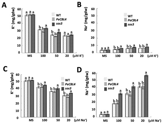 Through phenotypic analysis, we found that PeCBL4 transgenic plants complemented the phenotype of sos3 mutants under high salt stress but showed negative regulation under low K+ stress. To further validate these effects, we detected the K+ and Na+ contents of the WT, PeCBL4 transgenic plants, and sos3 mutant plants under different concentrations of K+ or Na+. As shown in Figure 4, the content of K+ in the whole seedlings decreased with a decrease in the concentration of K+ in the culture environment. The K+ in the whole seedlings decreased from 50–55 mg/gdw under MS to 20–25 mg/gdw under treatment with 20 µM K+ (Figure 5A). We also noted that the K+ content in the whole seedlings was higher in the sos3 mutants than in the WT and PeCBL4 transgenic plants under all conditions (Figure 5A). In addition, the amount of K+ in the sos3 mutants was less reduced compared with that of the WT and PeCBL4 transgenic plants (Figure 5A). On the contrary, the Na+ content in the whole seedlings gradually increased with a decrease in the concentration of K+ treatment (Figure 5B). The increase in Na+ content in the whole seedlings of the mutant was greater than that in the WT and PeCBL4 transgenic plants (Figure 5B). Overall, the ability of sos3 mutants to maintain K+ content in plants is greater than that of WT and transgenic plants. These results indicated that PeCBL4 transgenic plants exhibited a sensitive phenotype under low K+ stress.