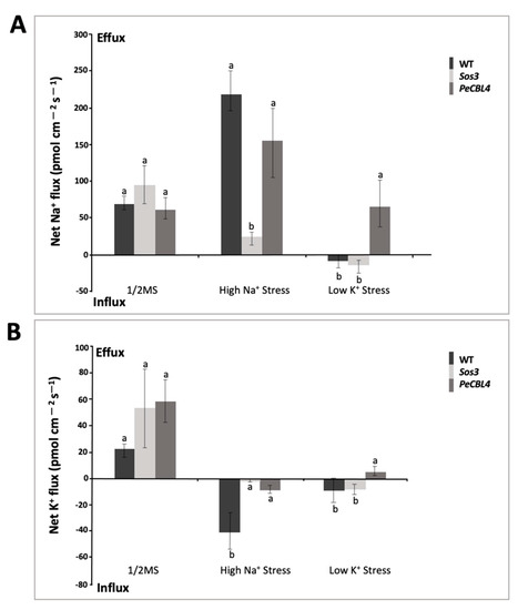 To further test the selectivity for K+ and Na+ in different plants, we detected the efflux and influx of K+ and Na+ in the WT, sos3 mutant, and PeCBL4 (PeSOS3) transgenic plants under normal growth conditions, high Na+ stress (150 mM NaCl treatment for 24 h), and low K+ stress (50 μM K+ treatment for 24 h).