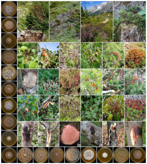 In Europe, aerial Phytophthora diseases have been studied mainly on agricultural crops [1,26,35,36,37,38] and to a much lesser extent on forest trees, especially in subalpine ecosystems [14]. Alpine and subalpine regions are important biodiversity hotspots for the flora, including a large number of plants and many endemisms in very confined environments and extreme conditions [39]. Due to the huge floristic diversity in small spatial scales, mountain forests could represent useful models to understand the ecological and evolutionary host–pathogen dynamics and to conserve pristine ecosystems [40,41].