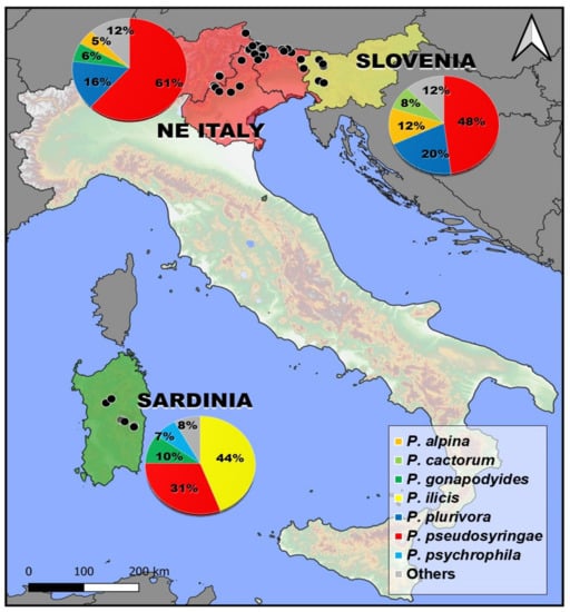 Phytophthora pseudosyringae and P. plurivora were the most frequently isolated species in NE Italy and Slovenia (Figure 2). In addition to these two species, some species belonging to clade 1, such as P. alpina and P. cactorum, were frequently isolated from different hosts in the NE Alps. In the mountainous areas of Sardinia, in addition to P. pseudosyringae, other two species P. ilicis and P. psychrophila belonging to clade 3 were constantly isolated (Figure 2).