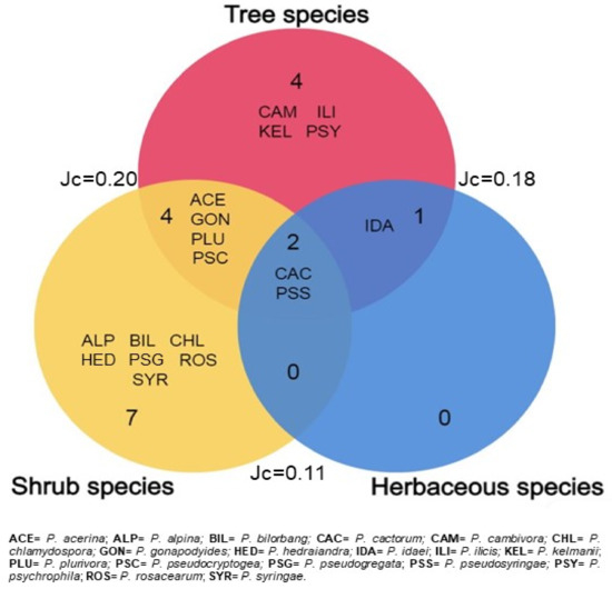 Tree and shrub species displayed the highest number of taxa and Shannon index (H) values. As regards the degree of similarity between the three Phytophthora communities, the Jaccard similarity index (Jc) was variable between 0.11 and 0.20. Only two Phytophthora species, P. pseudosyringae and P. cactorum, were isolated from all host groups. Relationships among the three categories of hosts are shown in Figure 3.