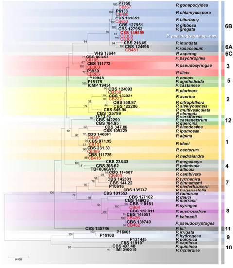 Maximum likelihood tree obtained from internal transcribed spacer (ITS) sequences of Phytophthora species representative of the 12 clades. Data are based on the General Time Reversible model. A discrete Gamma distribution was used to model evolutionary rate differences among sites. The tree is drawn to scale, with branch lengths measured in the number of substitutions per site. Bootstrap support values in percentage (1000 replicates) are given at the nodes. Ex-type cultures are in bold, and isolates obtained in this study in red.