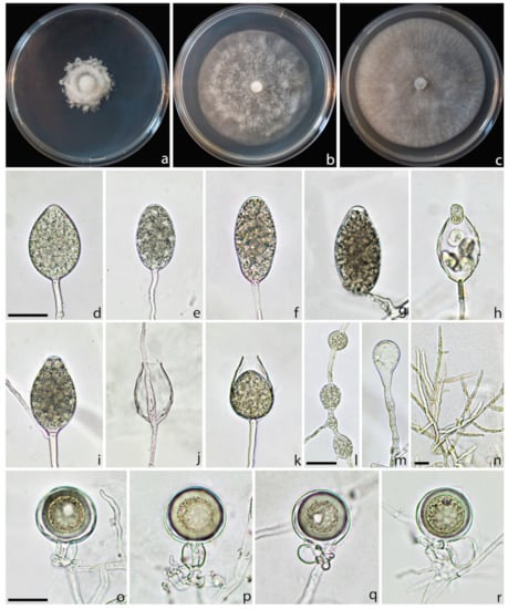 Description: Sporangia were produced on CA plugs flooded in unsterile pond water after 36–72 h of incubation at 25 °C on simple sporangiophores. Sporangia were persistent, mostly nonpapillate (80%), rarely semipapillate (20%), from ovoid to obpyriform, sometimes ellipsoid, borne terminally on unbranched sporangiophores, average 50.3 ± 6.5 × 29.9 ± 3.8 µm (total range 32.1–65.1 × 22.1–38.4 µm), with a length/breadth ratio of 1.7 ± 0.2 (n = 50) (Figure 6d–g). Zoospores were abundantly produced in liquid cultures after 24–36 h at 25 °C in the dark (Figure 6h). Sporangia proliferated, usually externally and rarely internally, in both a nested and extended way (Figure 6i–k). Hyphal swellings were not formed on solid agar and rarely in pond water, they were globose to subglobose, mostly intercalary catenulate, rarely terminal (Figure 6l–m). Chlamydospores were not observed. All isolates produced gametangia in single culture on carrot agar after 7–10 days at 20 °C in the dark. Oogonia were smooth-walled, borne mainly terminally, with an average diameter of 33.2 ± 3.4. Oospores were spherical and usually aplerotic and 29.0 ± 3.7 µm in diameter. Antheridia were mostly amphigynous (58%), less frequently paragynous (42%) hyaline, rounded, club-shaped, or irregular: average 16.2 ± 2.7 × 12.5 ± 2.2 µm (Figure 6o–r).