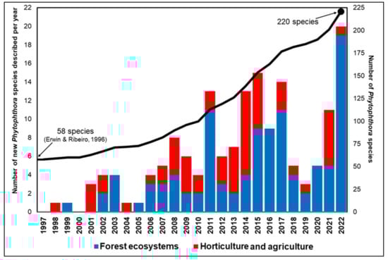Number of Phytophthora species described per year since 1997, divided into species isolated from nurseries and agriculture and forest ecosystems. The graph also reports the progression of the described species over time (black line). (Source: Scopus, May 2023 and IndexFungorum May 2023, [1]).