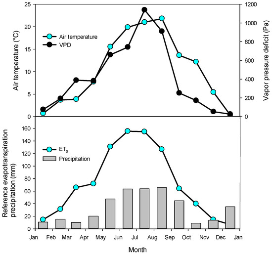 Weather at the research plot in 2022. Upper panel: monthly means of air temperature and vapor pressure deficit (VPD). Lower panel: monthly sums of precipitation and the reference evapotranspiration.