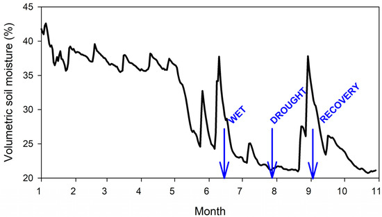 Volumetric soil moisture at the research plot. Three blue arrows indicate the days of measurement of photosynthesis.