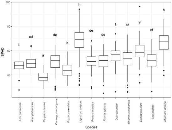 The relative concentration of chlorophyll in the leaves of trees and shrubs. Different letters indicate that the values of SPAD are significantly different. The box indicates the interquartile interval, where 50% of the data is found. The vertical line in the box indicates median. Data points outside this interval are represented as black points on the graph and considered potential outliers.