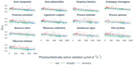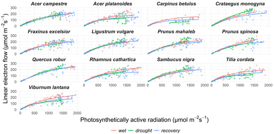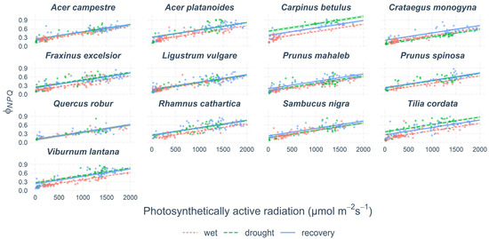 where is the maximal value of LEF and α is the slope. Predicted values for every species at all three days of measurement (wet, drought, recovery) were plotted over the measured points using the “ggplot2” package [40]. We tested the effect of the interaction of the day of the measurement and species on the relationship of ΦNPQ and ΦNO to the PAR using a linear regression model. Estimated mean values and their contrasts were estimated in the “model-based” package [41] using Holm p-value adjustment method. Plots of interaction effects in linear regression models were designed using the “interactions” package [42] and later adjusted by the “ggplot2” package to unify them with others. Weather and soil data were visualised using Sigmaplot 12.5 (Systat Software Inc., Chicago, IL, USA, 2016). The confidence level used for all analyses was 0.95 and the significance level was alpha = 0.05.
