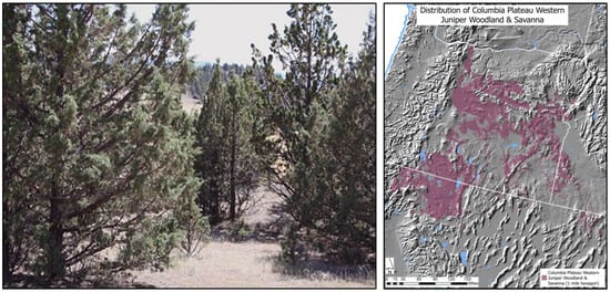 (left) A photo of the Columbia Plateau Western Juniper Woodland and Savanna (credit: USDA Forest Service); (right) The mapped distribution of this type concentrated in Oregon and adjacent states in the western USA (by 1 mile2 hexagon).