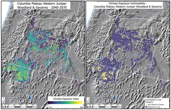 The climate change exposure for the mid-21st century expressed along a continuum (left) summarized by a 1 mile2 hexagon for Columbia Plateau Western Juniper Woodland and Savanna, and (right) segmented zones with 83% scores as moderate-to-low severity and 17% scores as severe-to-very severe.