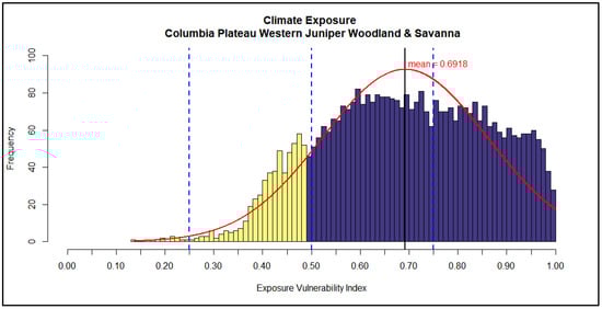 A histogram of the climate exposure for the Columbia Plateau Western Juniper Woodland and Savanna distribution, with thresholds indicated for zones (see Figure 4 right). The overall normal distribution is represented with a red line with a mean of 0.6918. The blue dashed lines delineate the four quartiles from 0 to 1 (0–0.25, 0.25–0.5, 0.5–0.75, and 0.75–1). No standard deviation lines are included in this graph. The data break between yellow and purple occurs at 0.49.