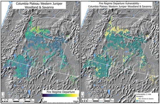 The HCCVI sensitivity measure of fire regime departure is displayed as a continuum (left) and segmented into “very severe to severe” vs. “moderate” departure (right) for the full distribution of Columbia Plateau Western Juniper Woodlands and Savanna.