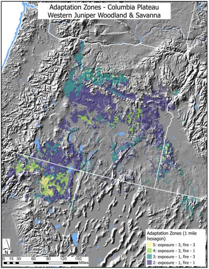 In contrast to these zones, about 10% of the combined area of these types was categorized under 2: Passive Resistance and suggests “actions to passively maintain current/historical structures and functions” []. The highest proportional area in this category is found in Columbia Plateau Western Juniper Woodland and Savanna (63%), our example used above for illustration. Many of the suggested management responses in these zones could concentrate on preventive measures like maintaining natural landscape connectivity. However, as noted above, there is quite a range of conditions suggesting more aggressive adaptation throughout the other 37% of this type’s distribution.