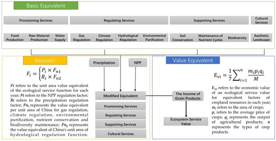 Next, given that the ecosystem services such as food supply, climate regulation, and biodiversity of the ecosystem are generally positively correlated with biomass, and the supply of water resources and the regulation of water temperature are highly correlated with changes in precipitation, in conjunction with the research results of other scholars, this study revised the equivalent values to attain an equivalent that can more accurately reflect spatial heterogeneity []. The specific process is illustrated in the following diagram (Figure 2):