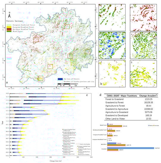 During this investigation, we discerned that those four types of forests—namely, Evergreen Needleleaf Forest (ENF), Evergreen Broadleaf Forest (EBF), Deciduous Broadleaf Forest (DBF), and Mixed Forest (MF)—underwent significant transformations. This was determined by analyzing the spatial pattern evolution of forest-cover data from 2001 to 2020 and calculating the characteristics of forest augmentation or diminution. It is evident (Figure 3a) that the distribution of forests within the research zone has conspicuously expanded and exhibited regional disparities over the past two decades, with the exception of a partial decline in the southeast region (Figure 3a-3). Owing to the elevated altitude and low annual average temperature in the western region, the primary increase is observed in Deciduous Broadleaf Forest (Figure 3a-2), while the southern region, with ample precipitation and heat conditions, predominantly experienced an increase in Evergreen Broadleaf Forest [,] (Figure 3a-5). Moreover, the terrain in the southeast is relatively flat with inconspicuous karstification, primarily constituting a non-karst area [,]. Contrasting with the relatively dispersed patches in other regions, various types of forests in this region have expanded over a substantial area. Lastly, in the northern region, characterized by the most intricate comprehensive effects of altitude, precipitation, and temperature, the four types of forests have augmented to varying extents.