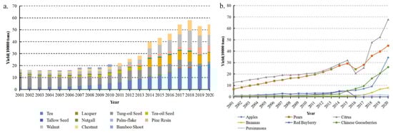 Changes of main forest products in the study area. (a) is the yield of forest products. (b) is the economic fruit yield.