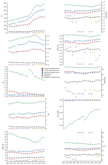 From the perspective of various indices, the Mixed Forest, Deciduous Broadleaf Forest (Fagaceae), Evergreen Broadleaf Forest, and Evergreen Coniferous Forest cluster significantly, and the landscape pattern is stable. However, in certain years, Closed Shrub Forest and Deciduous Coniferous Forest were not monitored, resulting in discontinuity in the distribution of the index. The ED, LPI, PD, and other indices have undergone abrupt changes in certain years, primarily affecting the Mixed Forest and Deciduous Broadleaf Forest. This indicates that the natural state of the forest has been severely disrupted during this period.