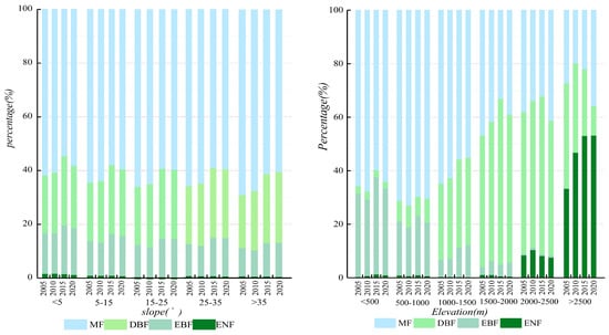 This study conducted statistics on the slope and elevation of forests at five-year intervals (Figure 6). The results revealed that the distribution of Mixed Forest and Deciduous Broadleaf Forest (Fagaceae) is essentially unrestricted by slope, while Evergreen Broadleaf Forest (Fagaceae) and Evergreen Coniferous Forest (Pinaceae) are more prevalently distributed in hilly regions with relatively gentle slopes. Concurrently, post-2015, the distribution proportion of Mixed Forests on all slopes has diminished, as the proportion of other Broadleaf Forests has escalated. Furthermore, through observing the elevation changes of various forests, it is discerned that Evergreen Broadleaf Forest and Mixed Forest tend to proliferate in low-altitude areas, constituting more than 90% of the forest types in areas below 500 m above sea level. However, Deciduous Broadleaf Forest is primarily distributed in the mid-altitude area. In the elevation range of 1500 m to 2500 m, the area of Deciduous Broadleaf Forest comprises more than half, and the high-altitude area is dominated by Coniferous Forest.