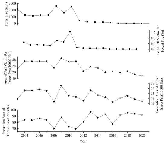 At the dawn of the 21st century, due to the obsolescence of forest management methodologies and awareness, the incidence rate of mountain fires remained elevated (Figure 7). For example, local funeral customs, such as the burning of incense, candles, and joss paper, can readily lead to forest fires. Moreover, due to the forest monitoring measures being limited to sporadic cameras and periodic drone inspections, it is challenging to detect fires promptly, resulting in the spread of wildfires []. There were 2154 forest fires in 2003 and 2612 in 2008. Although the scale of the fires was minimal and the proportion of affected forests was low, the local forest pattern would undergo alterations. Conversely, with the implementation of the disease and pest control project, the affected forests within the research zone have been promptly managed, and the prevention rate has exceeded 90% in the period from 2017 to 2020.