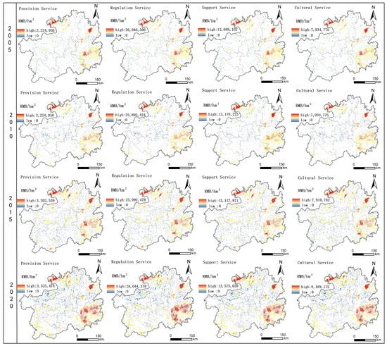 In this investigation, we employed the value-equivalent model to compute the value of ecosystem services within the research zone [,]. We spatialized the calculation results of Provisioning Services Value (PSV), Regulating Services Value (RSV), Supporting Services Value (SSV), and Cultural Services Value (CSV) through the method of Geographic Information System (GIS), allowing for an intuitive representation of the spatial distribution of PS in the study area on the map (Figure 8). The study discovered that the high-value areas of forest ecosystem services were distributed in Zunyi City in the north, Tongren City in the east, and Qiandongnan Autonomous Prefecture in the southeast. Among these three cities, there are Alsophila spinulosa (Cyatheaceae) National Nature Reserve in the north, Fanjing Mountain National Nature Reserve in the east, and Leigong Mountain Nature Reserve in the southeast, thereby forming a forest cluster with high ecosystem service value. By comparing the ecosystem services value (ESV) data at five-year intervals, the service capacity of PSV and CSV remained nearly unchanged, and SSV improved in 2010 compared to 2005. Subsequently, compared to 2010, the maximum value of ESV in 2015 experienced a slight decline, but the distribution area of middle and low values significantly expanded, and a new high value-gathering area emerged. In 2020, the service value of the four ecosystems improved. Specifically, the high-value gathering area in the southeast expanded significantly, the low-value area in the southwest evolved into a median area, while the high-altitude area in the northwest formed a new ESV cluster.