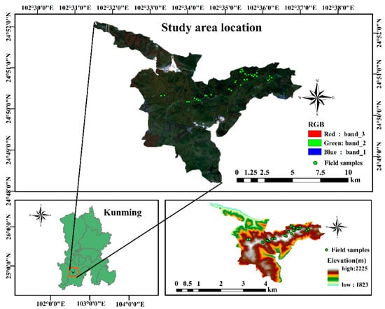 Haikou Forestry is located in Haikou Town, Xishan District, Kunming City, between 102°28′102°38′ E and 24°43′24°56′ N (see Figure 1); the altitude is 1800~2400 m, and the forest coverage is greater than 80%, encompassing approximately 7500 hectares. It is predominantly mountainous, with high terrain in the south and low terrain in the north, and the ridges run predominantly northeast–southwest. Haikou Forestry is a highland subtropical plateau mountain monsoon climate, dry and wet, with a small annual temperature difference and a large daily difference; the annual average temperature is 14.7 °C; a frost-free period can reach more than 240 days; the annual average sunshine time is approximately 2200 h; snowfall is uncommon; the annual average rainfall can reach between 900 and 1200 mm, and is primarily concentrated from May to July. The main tree species in the forest include Yunnan Qinggang (Cyclobalanopsis glaucoides Schottky.), Yunnan pine (Pinus yunnanensis Franch.), Huashan pine (Pinus armandi Franch.), Yunnan oil fir (Keteleeria evelyniana Mast.) Yuanjiang tannin (Castanopsis orthacantha Franch.), oak (Quercus), alder (Alnus cremastogyne Burk.), alpine tannin (Castanopsis delavayi), etc. [,,].