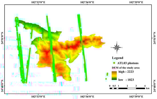 Distribution of ICESat-2/ATLAS light spots covering the study area obtained in this study.
