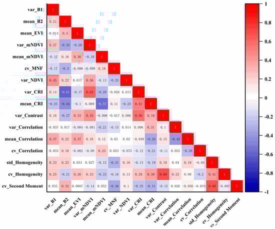 Before modeling tree species diversity, the aforementioned spectral variables derived from the GF-1/PMS images had to be decorrelated, i.e., feature variables with correlation coefficients r > 0.70 were removed, and a total of 16 spectral variables, as shown in Figure 3, were retained to form the final set of alternate spectral variation features.