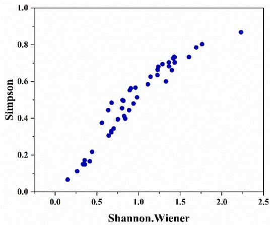 Scatter plot of Shannon–Wiener and Simpson diversity indices in the sample area.