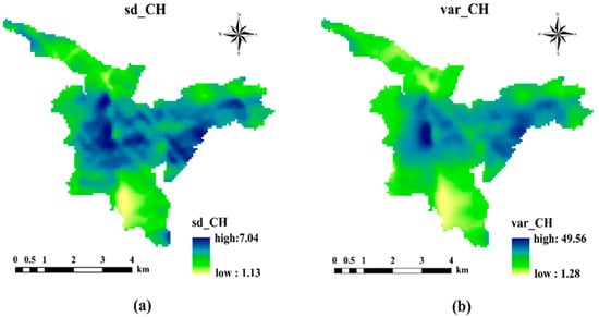 Table 6 summarizes the optimal variance function theoretical models for each ICESat-2 light-spot factor-based vertical structural variation feature. The analysis of the structure of the variance functions shows that the exponential model fits the vertical structural variance features in the study area better overall. The optimal variation function theoretical models for features sd_CH, var_CH, and mean_CH are all exponential models, while the optimal variation function theoretical model for feature cv_RH is spherical. The variance degrees of the above four vertical remote sensing variance features are all <11%, the spatial autocorrelation is very significant, and all of them have the conditions for spatial interpolation (Figure 5).